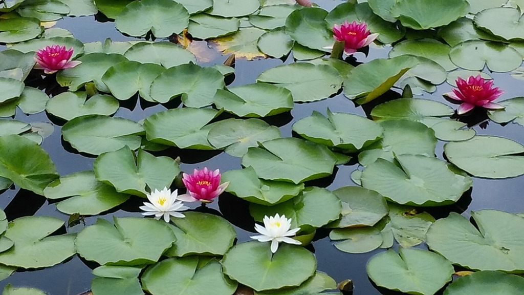 池にはスイレンが咲いていました。昨年はピンクばかりだったと思いますが、今年は白がけっこう咲いていて綺麗でした。