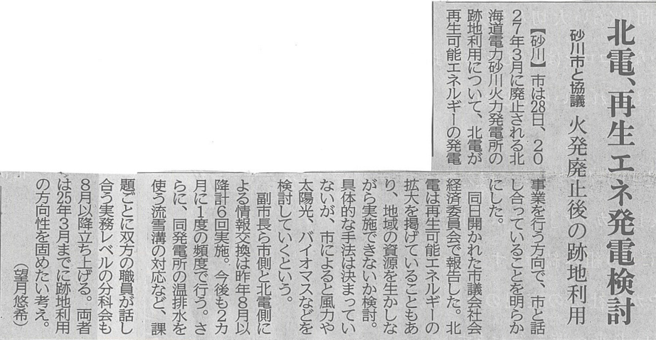 答弁では『北海道電力は風力、太陽光、バイオマス、地熱、水力など再生可能エネルギーを拡大できるような発電できる施設を考えている』とのこと。