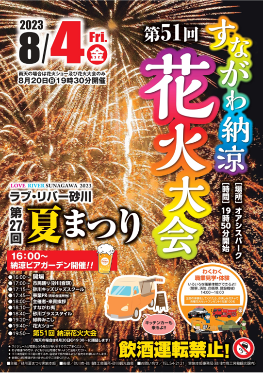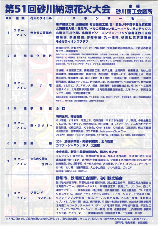 この花火大会は砂川商工会議所が主催するもので、右の写真のようにたくさんの企業さんの協力で行われています。