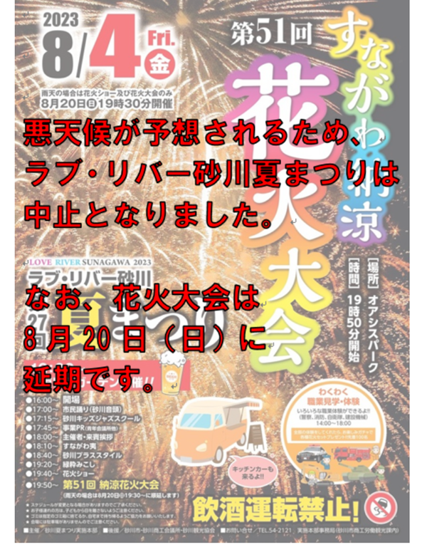 8月20日(日)に延期された「第51回 すながわ納涼 花火大会」を楽しみに待つことにしましょう。