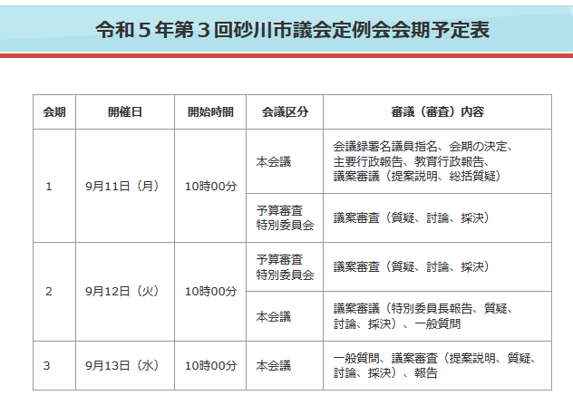 また、砂川市議会のHPに「令和5年第3回砂川市議会定例会議案」がUPされていますのでリンクします。