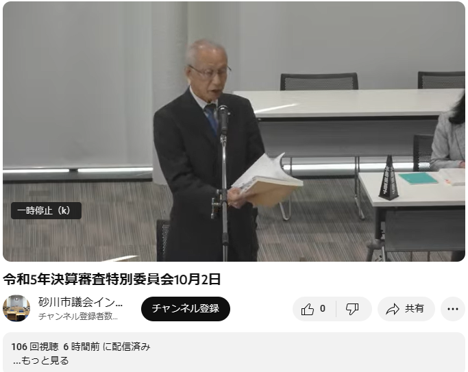 会場は市役所2階大会議室でした。YouTubeに編集前のインターネット中継「令和5年決算審査特別委員会10月2日」が残っていますのでリンクします。