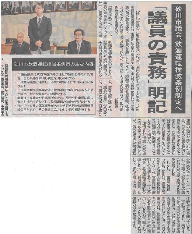 砂川市飲酒運転撲滅に関する条例(案)の新聞記事