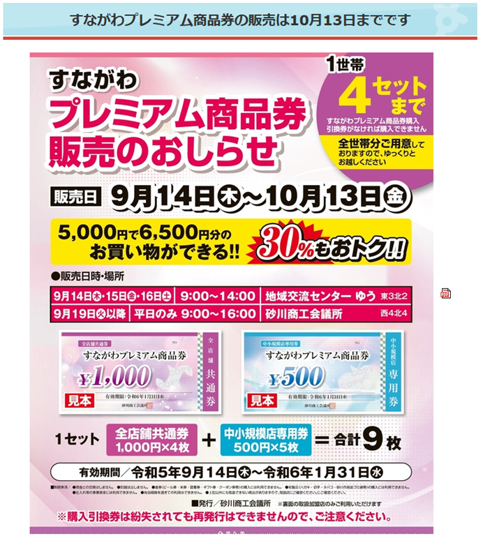 さて、私も様子を見に行きましたが、9月14日から販売された30%がお得になる「すながわプレミアム商品券」の販売終了が迫りました。