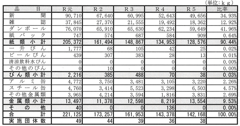 また、最近は晴見町内会でも資源ごみの回収量がとても少なくなっているのを感じています。以下の表は品目別の回収量の推移。