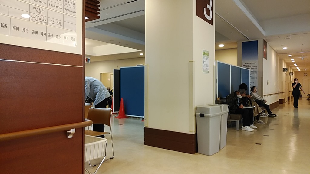 市立病院に行ったのが午前11時ごろ。月曜日のせいか、とても混んでいました。内科・循環器科の外来受付の前に青いパーテーションで囲った所があります。