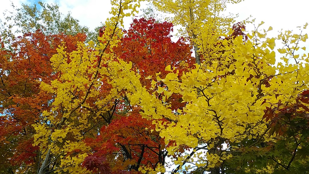 今年は紅葉の進み方がいつもと違うように感じます。銀杏の木も緑の葉の所がたくさんありますが、落ち葉も多くて、ピンネに冠雪ですが、まだ夏の余韻も残っているような今です。