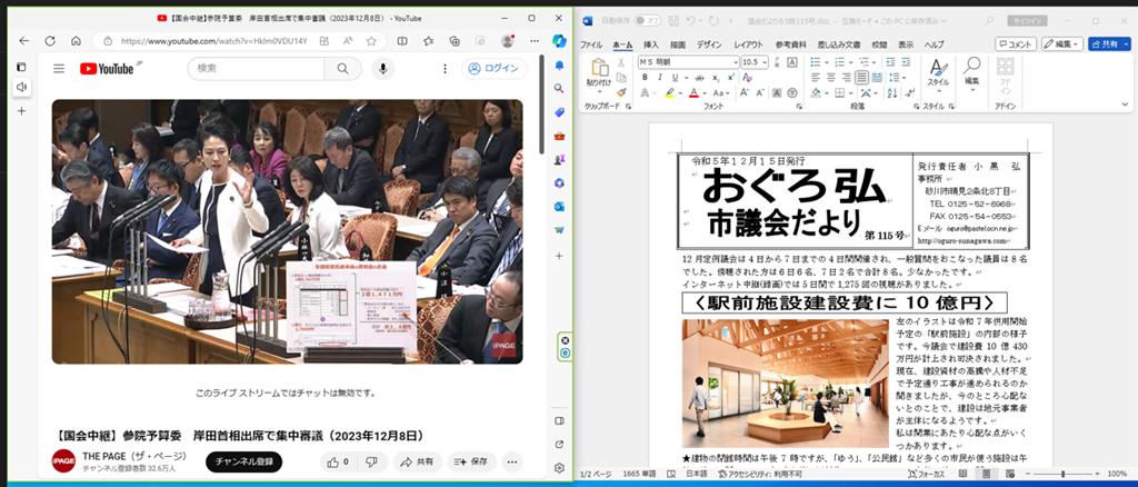 とても便利になって私のモニター内で国会中継を傍聴しながら「おぐろ弘 市議会だより 第115号」を作成していました。