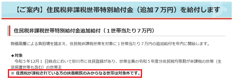 上の写真は砂川市の「住民税非課税世帯特別給付金(追加7万円)を給付します」から切り抜きましたが、赤い線で囲ってあるのは私が加工しました。