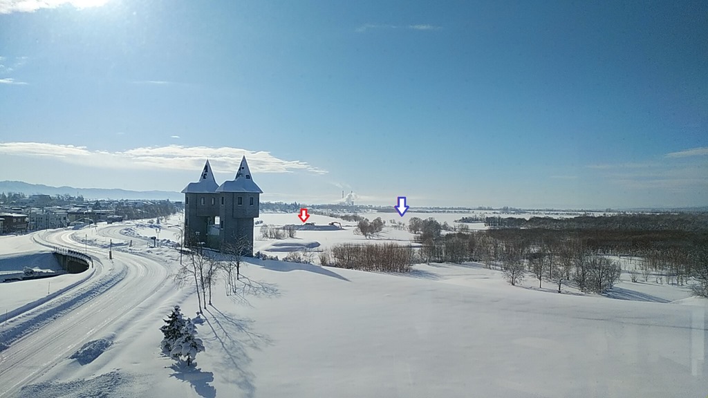 そして、青い矢印ですが、オアシスパークの水面の場所が白く見えています。この頃の寒さで全面的に結氷したのかもしれません。