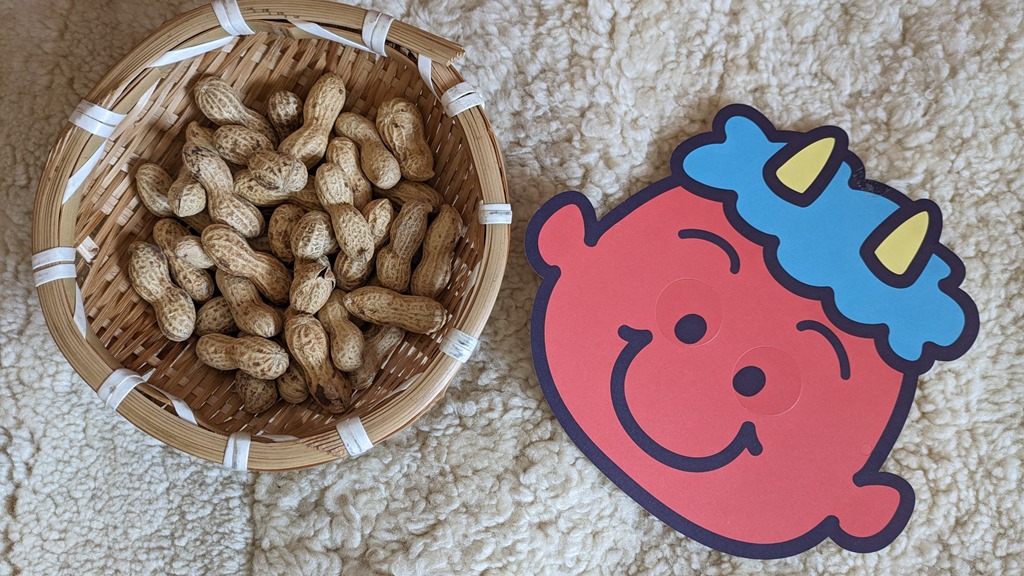 節分でまく豆は?調査によると青は落花生、ピンクは大豆だそうです。我が家も毎年豆まきをします。