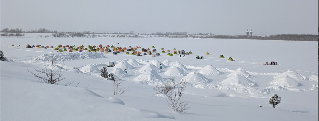 今日のテントの数は130張を超えていました。そして、手前のいくつもある小山は何でしょう。今日は寒かったので下に降りませんでしたが、多分、11日(日)に開催される青年会議所主催の「すながわ冬まつり」の「かまくらづくり」の準備ではないかと思います。