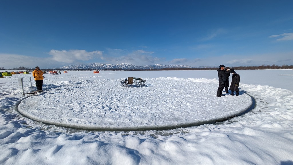 ワカサギ釣りの皆さんの駐車場は上の写真の左端。冬まつりの皆さんは管理棟の駐車場に分けられてスムーズな運営がされていましたが、こうするのが大変なんです。