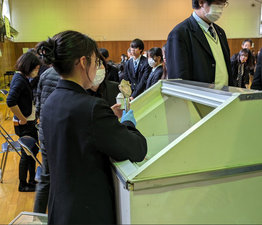上の写真左は砂川ハイウェイオアシスでPOPの作成、包装、ラッピングを教わりました。そして右の写真は岩瀬牧場。ジェラートの盛り付けや箱折りの体験をしています。