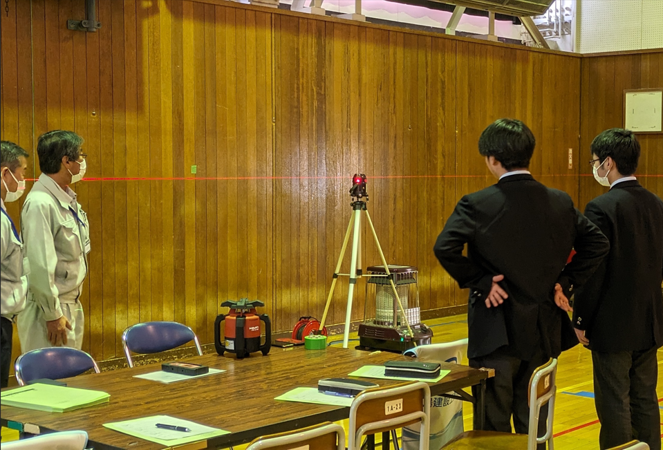 写真左は桜井千田でコンクリートや測量の体験。右は水島建設工業で業務内容の説明やレザー墨出し体験を行いました。