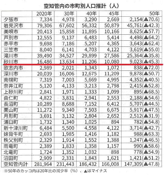 例の「国立社会保障・人口問題研究所」がまとめた地域別将来人口推計を道新さんがまとめてくれた空知管内の表なのであまり嬉しくない内容ですが。