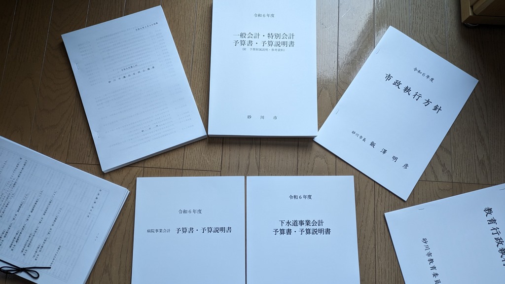 左から令和5年度の補正予算、条例改正などの議案書、令和6年度一般会計等予算書(分厚いです)、市政執行方針、教育行政執行方針。そして、下に並べた左は令和6年度病院事業会計予算書と右は下水道事業会計予算書です。