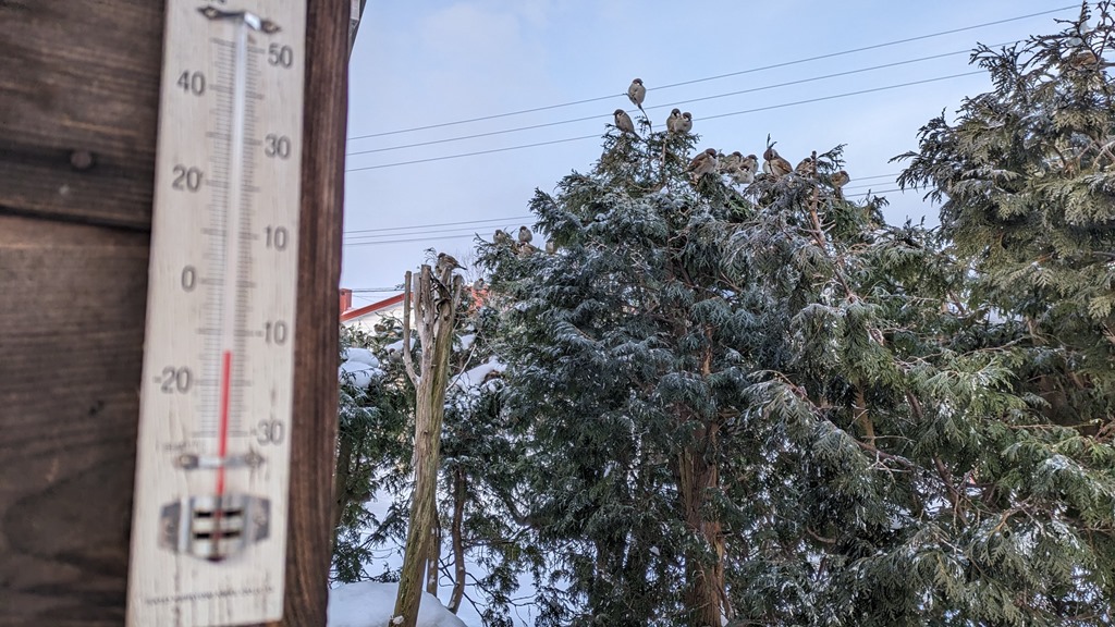 我が家の外の温度計は-13℃を指していました。スズメたちは毎朝、私を待っています。