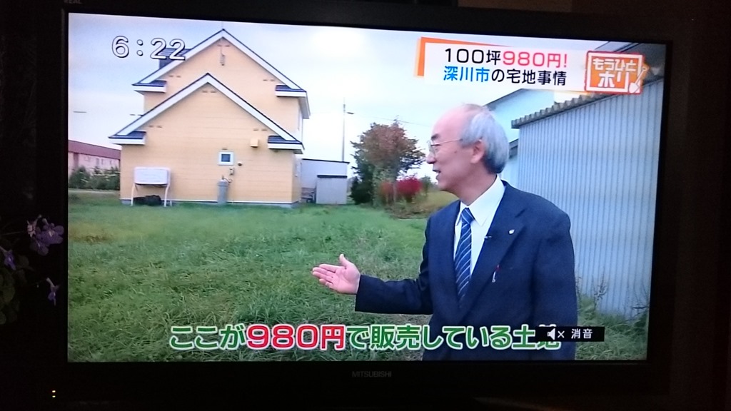 上の写真は10月28日の夕方のテレビ番組で特集されていた深川市の「100坪 980円で販売」の画像です。