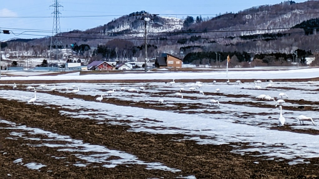 上の写真はお隣の奈井江町の田んぼです。白鳥がたくさんいました。砂川市内ではまだまだ雪が積もっていますが、この田んぼは特別なことでもされているのか、土が出ていました。