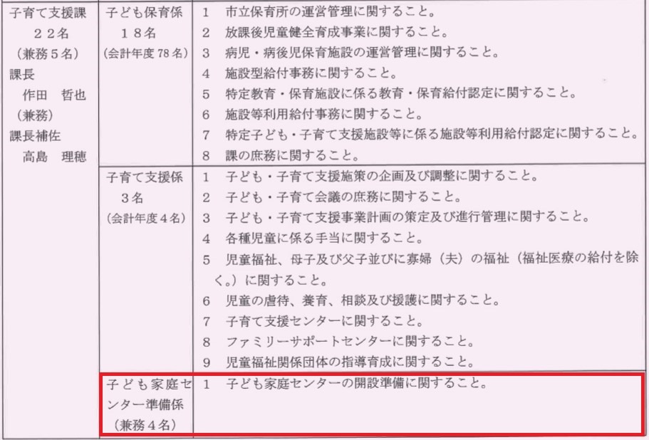 保健福祉部に新年度から「子育て支援課」が新設されました。どのような事務を取り扱うのかを示す事務分掌が報告されました。以下の通り