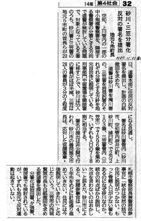 記事によると昨日(20日)に砂川署と三笠署の地元5市町の首長らが道警本部に住民の反対署名を提出し、計画の白紙撤回を求めたとあります。