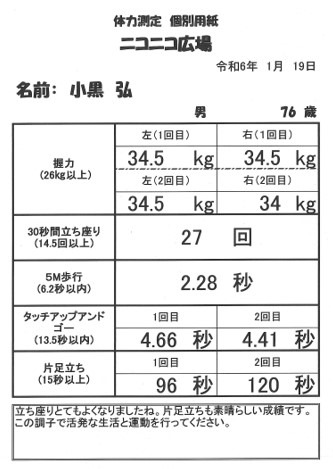 上の左はこれだけ毎日続けていればロコモになるのを防げるそうですので参考に。そして、右ですが、私の体力測定結果表です。最後の欄に「この調子で活発な生活と運動を行ってください。」と書いてありました。この調子で頑張ります!