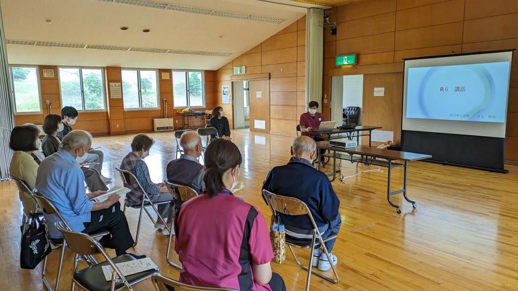 「ニコニコ広場」を始め地域運動サロン活動は「ふれあいセンター」の事業。今日も保健師さんと砂川市立病院リハビリ科の水上先生のお話を聞きました。