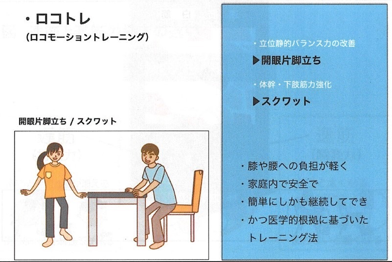 私たち高齢者は「ロコモ」(立つ、歩くといった機能が低下している状態)にならないよう気を付けなければならないとのこと。そのためには日常の運動だそうです。