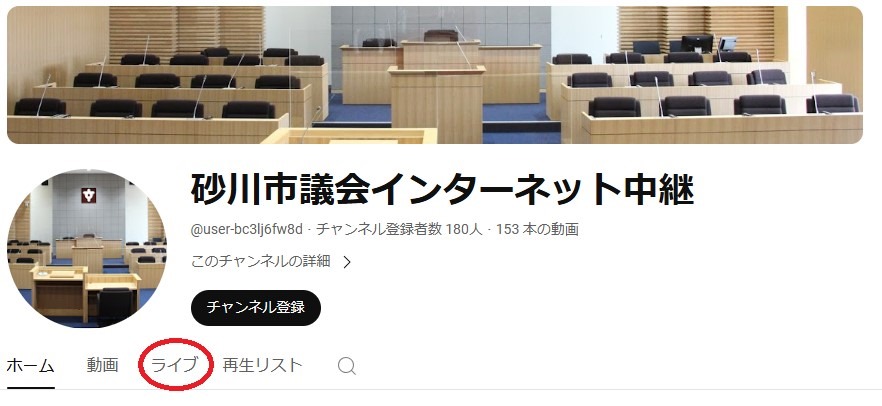 しかし、YouTubeに残っているインターネット中継を見る方法は。まず、砂川市のHPのトップ画面の下の方に「砂川市議会」のバナーをクリック。続いて「砂川市議会インターネット中継」をクリックすると「ライブ中継」と書かれたところがあり、そのすぐ下に「砂川市議会YouTubeチャンネル 砂川市議会インターネット中継」をクリックします。すると
