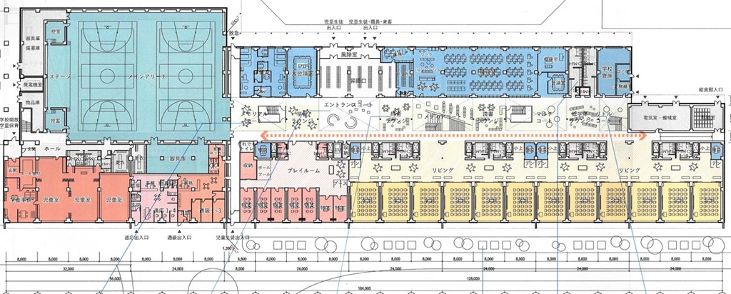 上は基本設計図の概要から1階の平面図ですが、校舎の長さは184mでした。
