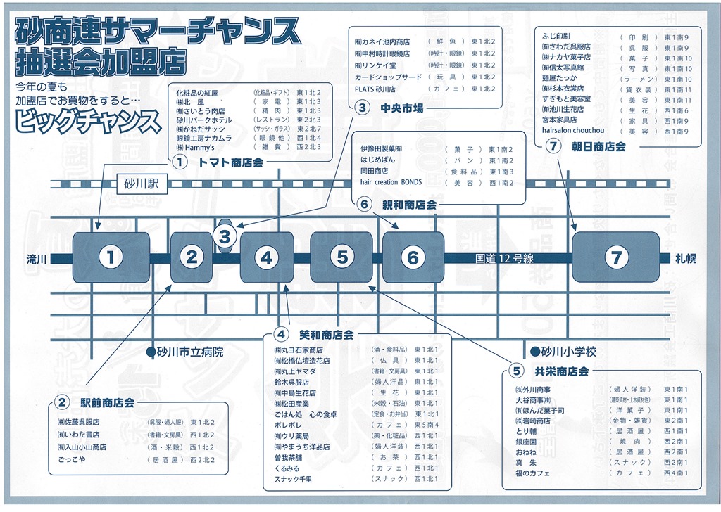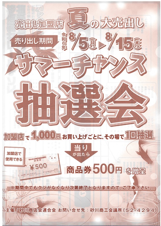 明日5日月曜日から始まる、夏の大売出し「サマーチャンス 抽選会」は加盟店で1000円買うと、その場で1回抽選ができます。当たれば商品券500円がもらえます。