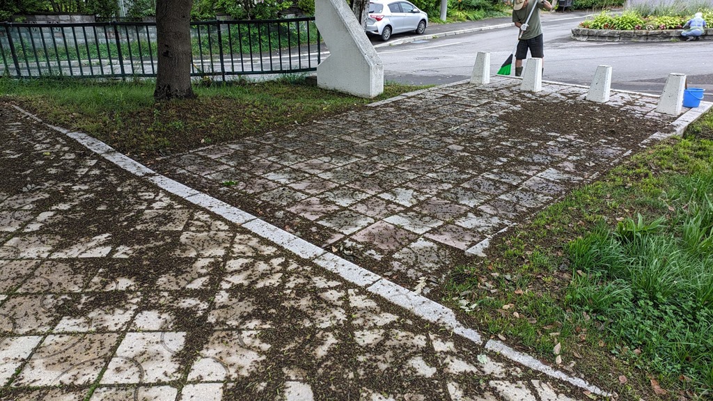 ここの所続いた風雨が原因でしょうか。公園に植わっている木の花か実で「えらい事」になっていました。ホウキで掃除をして、公園周辺の歩道と車道の間に生えた雑草取りをして、ロータリーの花壇の雑草を抜いて、人数こそ少なくなりましたがキレイになりました。