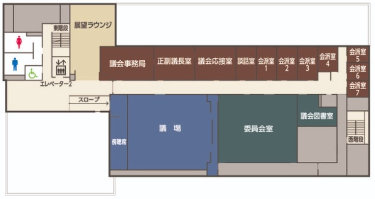 上のイラストは砂川市のHPからいただきました。市役所4階の議会フロアーです。