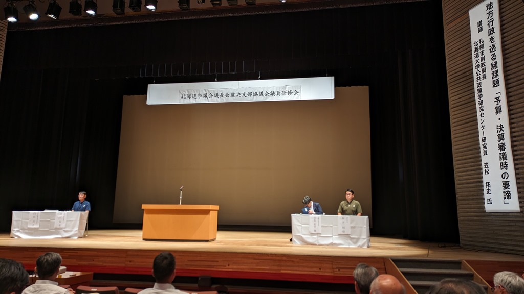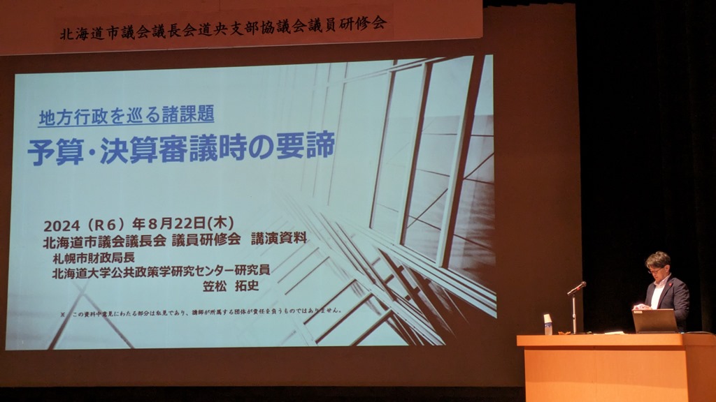 まずは講演です。上の写真のテーマで札幌市財政局長の笠松拓史さんでした。笠松さんは総務省官房付から現職に出向されている財政のプロ中のプロ。その方から勉強させていただきました。