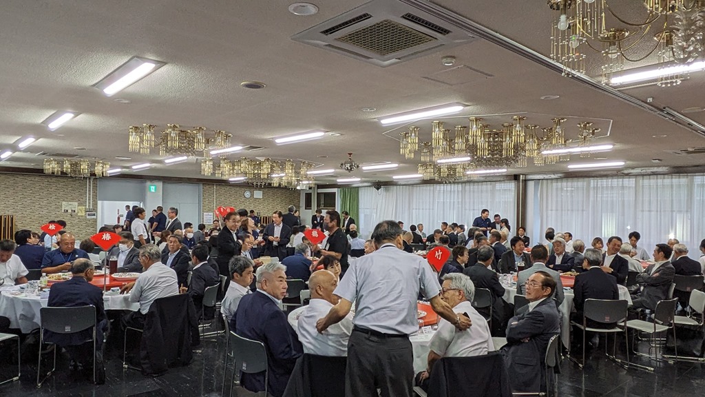 あまり懇親会の様子はUPしないのですが、こんな感じで10市の議員たちが情報交換をします。議長、副議長は同じメンバーがテーブルに着きますので名刺交換はありません。