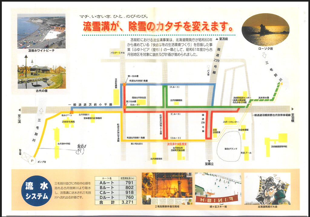 苫前町は風力発電で有名な人口2,683人の日本海沿いの町です。流雪溝は少し山側に入った古丹別地区で運用されていました。