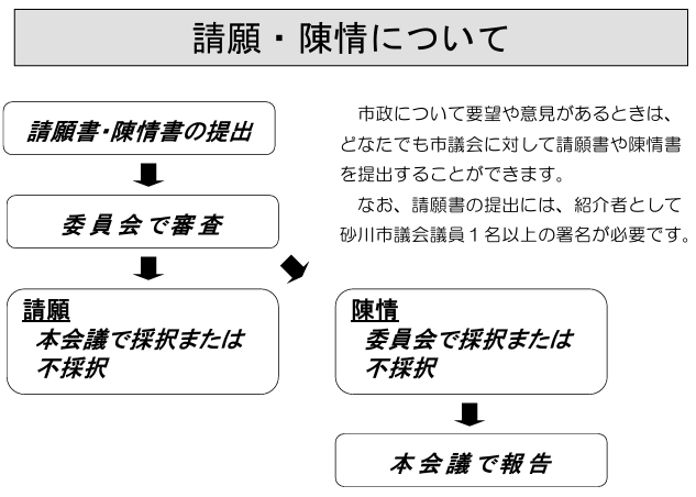 今回予定されているのは請願書ではなく、陳情書のようですが、砂川市議会では提出された場合、所管する常任委員会で審議することになります。