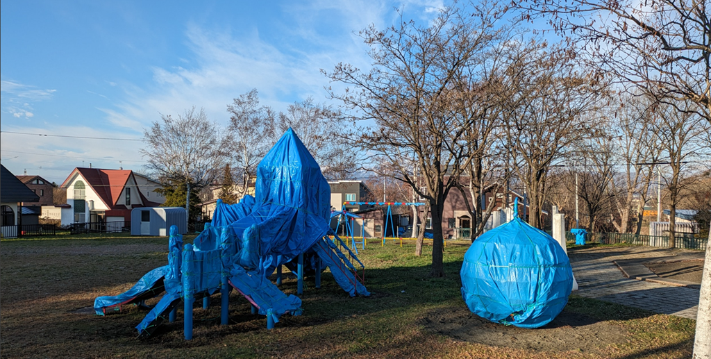 まずは晴見公園の遊具の冬囲い。長い冬を前にしての作業ですが上手にビニールシートで覆われました。ちょっとした芸術作品のよう。いい仕事です。
