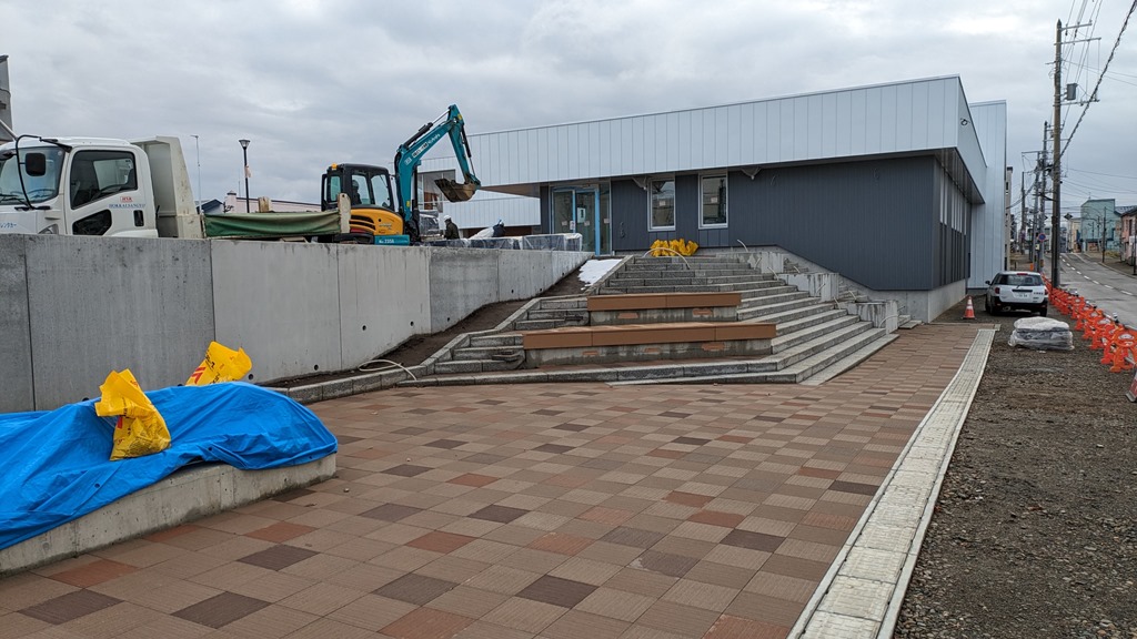 続いてこちらは、柳通り側の階段公園(?)。だいぶ完成に近そうです。違う角度から見ると