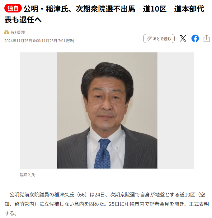 芦別市出身の稲津前議員さんは選挙の時ばかりではなく、日頃もよく地元を回られる方で、偶然お会いしてもにこやかに挨拶を交わさせていただいておりました。違う記事で、次期衆院選は出なくても政治活動は続けるとのコメントもありました。