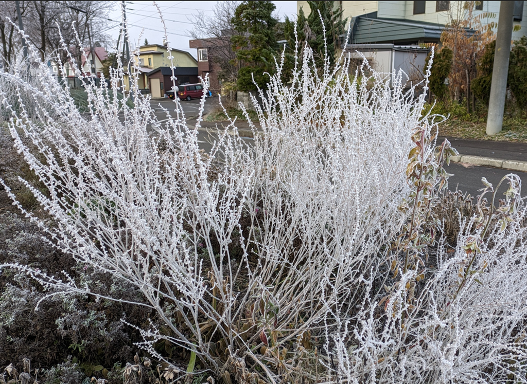 これはどうして出来るのか分からないのですが、霜が凍ってできるのか。町内会にあるロータリーの花壇です。日が射せば消えてしまう一瞬の美しさ。