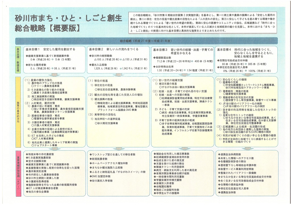 上の写真は「砂川市まち・ひと・しごと創生総合戦略」の概要版ですが、以下にpdfでUPします。