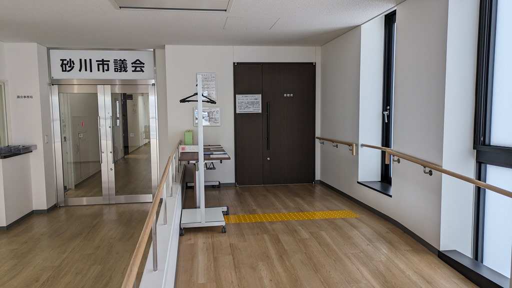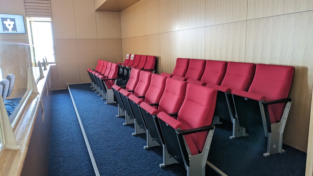 左の写真のテーブルに置いてある用紙に名前と住所を書いて受付箱に入れるだけでOKです。あとはドアーを開けてエンジのイスが傍聴席なので、ゆっくり傍聴してください。