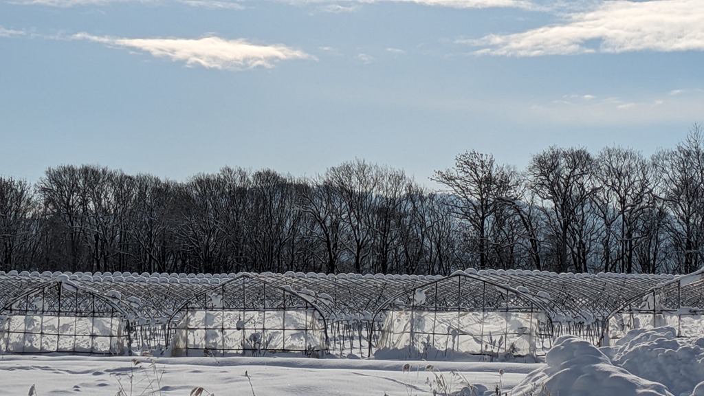 外を回っていると上の写真のような風景にも出会います。ビニールが無くなったビニールハウスの屋根に雪玉が並んで楽しい。