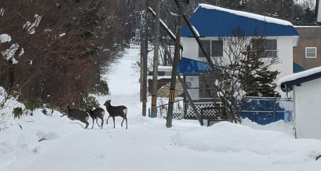 私の車の前を堂々と横切るエゾシカの家族。かどうか分かりませんが、みんなが行った後に小鹿が横切って行ったので家族でしょう。