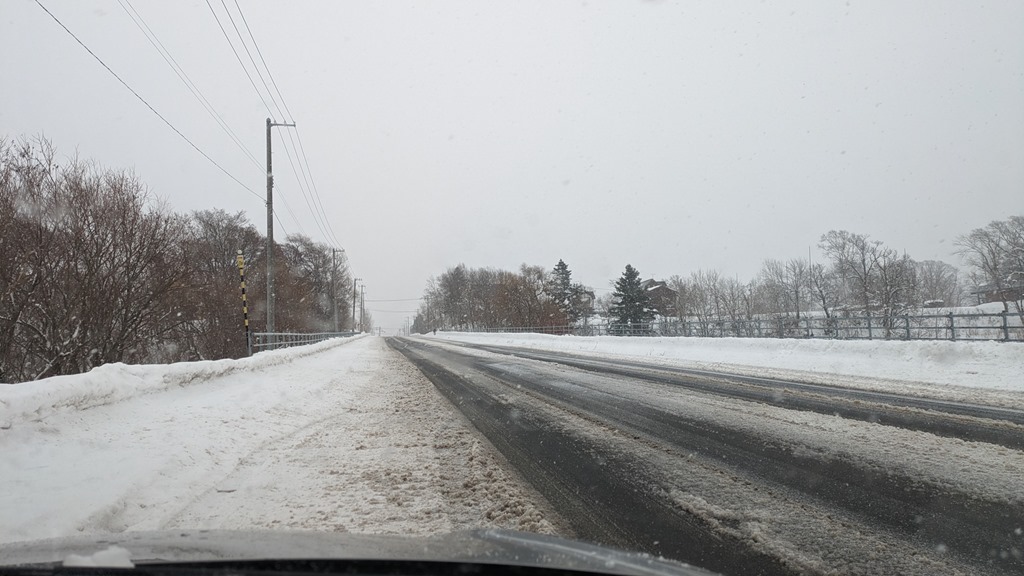 我が家に向かう道々ですが、国道はもちろん、こちらもアスファルトが出ていました。プラスの気温になるとこうなります。