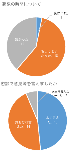 上の写真右はアンケート結果ですが、懇談会を実施したことについては全員の皆さんが「評価する」と答えていただきホッとしています。
