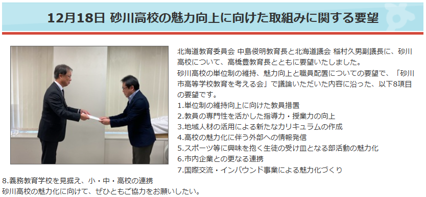12月18日に道教委の教育長と砂川市出身の稲村道議に要望書を提出したとの内容です。