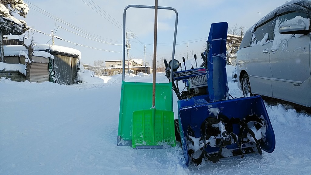 青は小型除雪機。そして、ママさんダンプと柄の長いスコップですが、今日は2時間ほど外作業をしていました。